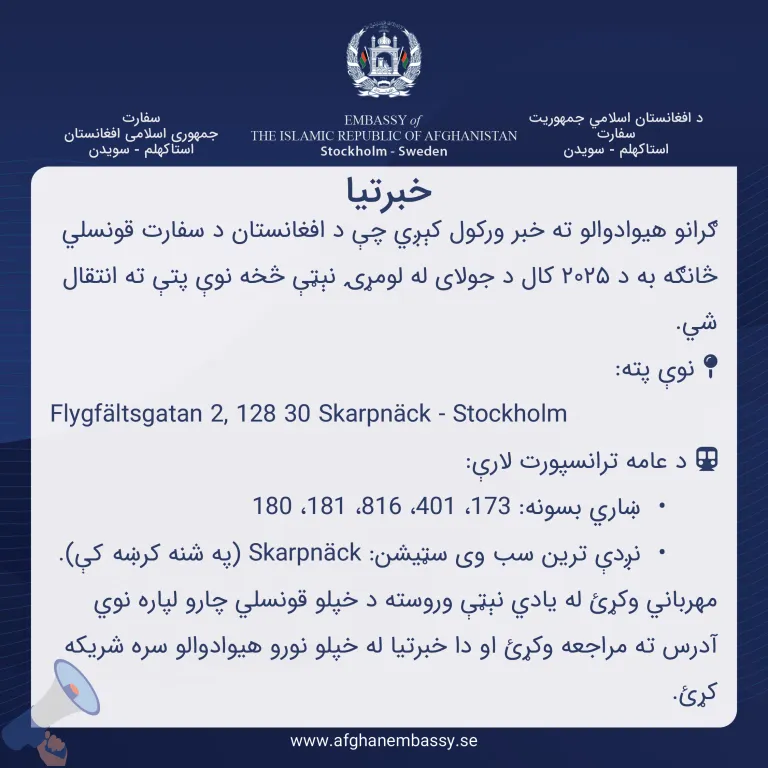 خبرتیا28/05/2025Uncategorized @ps د کورپاڼه Uncategorized @ps خبرتیا خبرتیاد ټولو درنو هېوادوالو او محترمو مراجعينو ته خبر ورکول کېږي چې د کوربه هېواد د رسمي رخصتۍ له امله، سفارت او قونسلي څانګه به د پنجشنبې په ورځ، د مې د مياشتې په ۲۹مه نېټه، تړلي وي.مهرباني وکړئ خپل قونسلي امور له دې رخصتۍ سره سم تنظيم کړئ.په درناوي،د افغانستان د اسلامي جمهوریت سفارت SHARE ON SOCIAL MEDIA